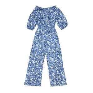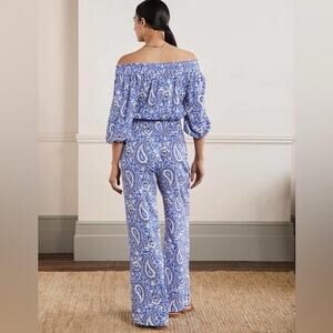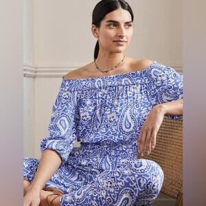 Step into effortless elegance with this Boden paisley print off-shoulder jumpsuit. Crafted from a lightweight, breathable fabric, this stylish one-piece features an elasticized off-the-shoulder neckline, stretch waist for comfort, and wide-leg silhouette for a flattering, flowy fit. Perfect for summer events, vacations, or casual outings, it combines comfort with chic bohemian charm.