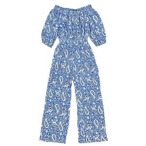 Boden Paisley Blue Off Shoulder Jumpsuit Stretch Waist Lightweight Size 12R NWT
