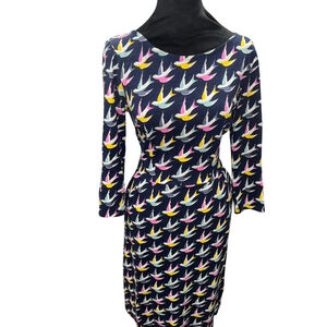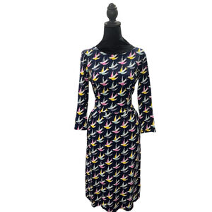 Boden Penny Jersey Swallow Dress Size UK 10L/US 6L Navy 3/4 sleeves midi preppy