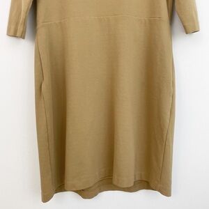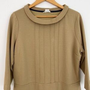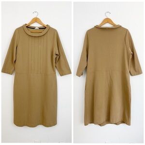 Boden Peter Pan Collar Cotton Blend Tan Mid Dress. 3/4 sleeves. Size 12R. Fit and flare. Thick fabric for smoothing out curves. Lined. Hidden side zipper. Pleated details on the chest.