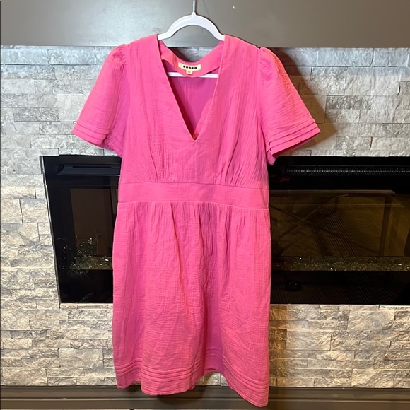 This pretty in pink Boden dress is ideal for casual spring and summer settings. It boasts a chic V-neckline and playful puff sleeves, enhancing its elegant A-line silhouette. The waist is gartered in the back for a better fit. 2 pockets on the sides