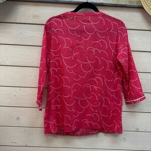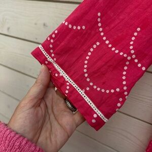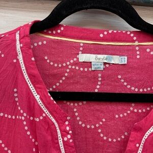 Bright, cheerful, and perfect for layering, this Boden tunic features a lively pink hue with white dotted accents in a scalloped pattern. Finished with delicate embroidered trim along the neckline and cuffs, it’s a versatile piece that works for casual days, travel, or an easy beach cover-up.