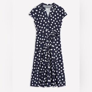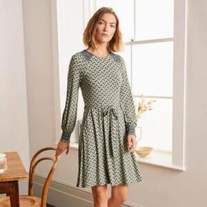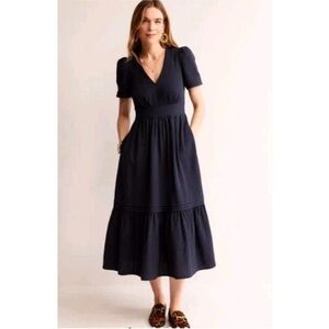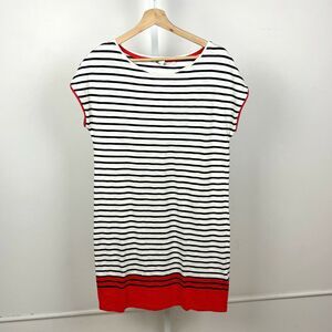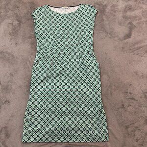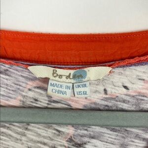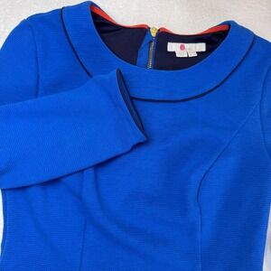 This Boden sheath midi dress showcases a vibrant geometric pattern in purple and orange, perfect for casual outings. It features a flattering V-neckline with a contrasting orange trim and stylish 3/4 sleeves, making it a versatile addition to your wardrobe. See size tag.
