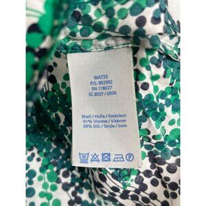 This elegant Boden Ravello blouse features a silk blend with a pleated neckline, offering a chic look for any occasion. The cap sleeves add a touch of sophistication to its green and black design, perfect for a stylish wardrobe update.