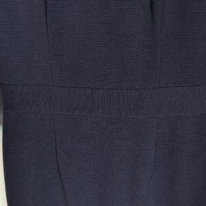 Navy blue with white trim. Rounded neckline. 3/4 length sleeves. Banded waistline. Knee length skirt. Zip back. Fully lined. The piping on the collar is slightly wavy (please see photos for details), but there are no stains, holes, or fraying. Laid flat pit-to-pit: 15in. Laid flat waist: 13.5in. Shoulder to hem: 38.5in.