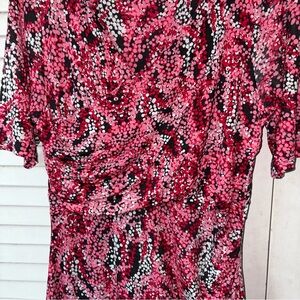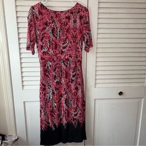 Boden Rita Dress in wisteria floral print, size 4. The ruching at the top is a figure-flattering, The color is a pink, red, and white floral-like print with black at the bottom. Fitted, midi dress with short sleeves.