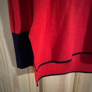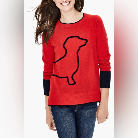 Vibrant red sweater with a bold dog design. Features contrasting cuffs. Ideal for a playful look. Color is a deep navy reads as black in photos.
