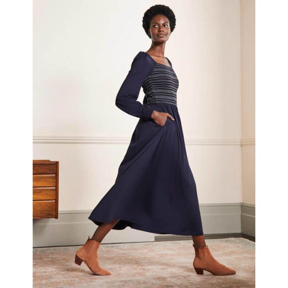 This Boden midi dress is the definition of effortless polish, featuring a rich navy tone with subtle striped bodice detailing for a flattering, elevated look. The long sleeves and flowy midi skirt create a timeless silhouette that works beautifully for workdays, dinners, or dressed-up everyday moments. Classic, versatile, and endlessly wearable.