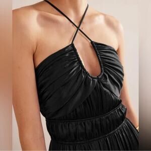 With a ruched bodice and halterneck ties, this recycled satin dress is equally romantic and elegant.