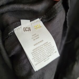 measures approximately 16" from pit to pit, 13.5" flat across waist, 23" flat across hips, 50" long excluding straps