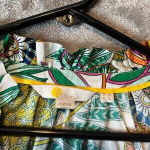 Super cute Boden top featuring a tropical pineapple print. The top has ruffle detailing and smocked cuffs, adding a touch of playfulness. Made from 100% cotton, it's breathable and comfortable, perfect for warm weather. In excellent condition, ready to add a pop of color to your wardrobe!