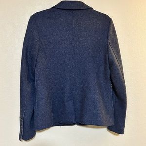A sweater material with enough structure to make you feel put together but the softness of this material will keep you warm and comfortable. A classic navy color with some understated stitched detailing makes this classic piece from Boden a quality item you will have for a long time. The blazer typically hits at the hip. Not lined.