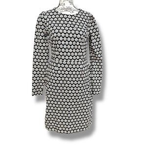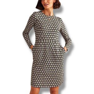 The Boden Size 4 Black Floral Penelope Jersey Dress is a classic and versatile piece perfect for any woman's wardrobe. Made from 100% cotton jersey fabric, this knee-length dress features a flattering pencil silhouette with long sleeves and a crew neck neckline. The elegant black floral pattern adds a touch of femininity to this stylish overall dress, making it a must-have for any occasion. Ideal for a classic and timeless look, this dress is a perfect addition for any woman who values comfort and style.