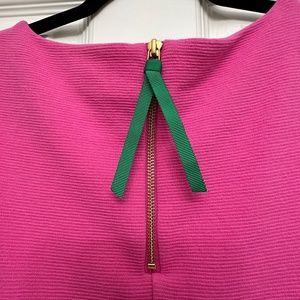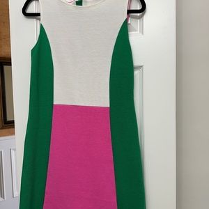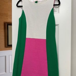 Adorable sleeveless dress by Boden, done in a color-blocked style with off-white, green and pink! A cute and fun, preppy style, great for spring in a stretchy Ponte knit fabric. There is no care tag on the inside of the dress, but it is an easy care fabric that can easily be washed on cold and air dried or machine dried on LOW. Comes from a smoke/pet free home. Dress is size 4 R and it is midi. When laying flat, measures 16" across from pit to pit, 15.5" at the waist, and 33.5" long from the top of the shoulder to the bottom hem.