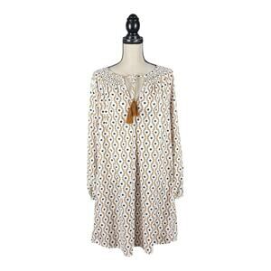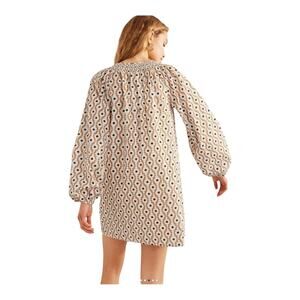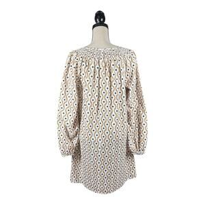 Boden Smocked Neck Beach Kaftan Dress in a size 8 Long. In the color Geometric Cashew Trance. Lightweight cotton. Smocked neckline with tasseled ties. Full elastic banded sleeves. 100% cotton. Measures approximately 22” armpit to armpit and 37” in length. In great condition.
