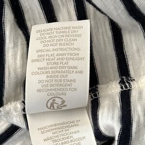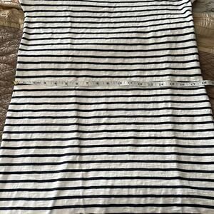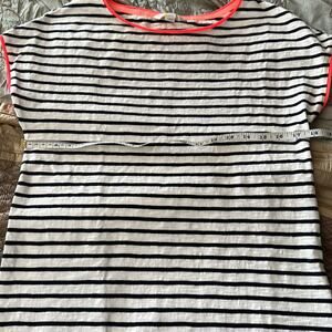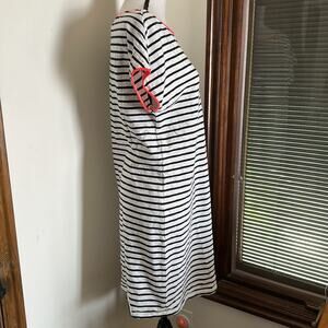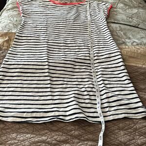 Cute and perfect to wear in the summer. Navy blue/black and white striped 100% cotton shirt dress with bright orange trimming on the neckline and sleeves. This is in great used condition, no flaws or damage to note.