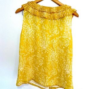 Vibrant sunflower yellow blouse. Sleeveless with ruffled neckline. White speckled pattern throughout.