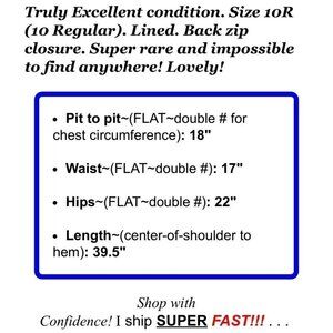 Truly Excellent condition. Size 10R (10 Regular). Lined. Back zip closure. Super rare and impossible to find anywhere! Lovely!