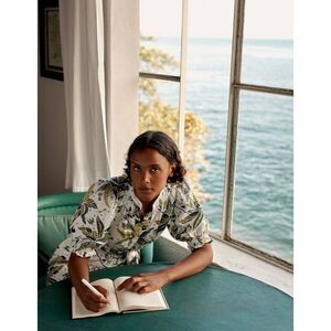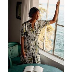 Boden Sz US 10 Smocked Linen Shirt Dress White Floral Green Bird Leaves Resort