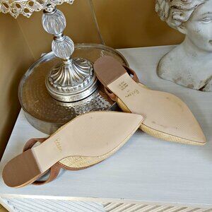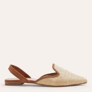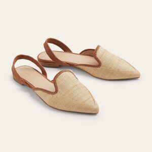 Stylish Boden flats with a pointed toe. Tan woven texture with brown trim. Comfortable slingback design.