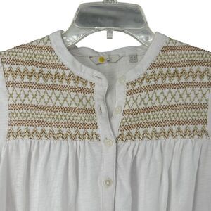 Boden Top Smocked Embroidered Yoke Collarless Button Up White Long Sleeve Classic Bohemian Peasant All Seasons Cotton Blend
