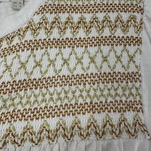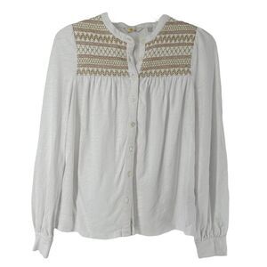 Boden Top Smocked Embroidered Yoke Collarless Button Up White Size 4 Long Sleeve