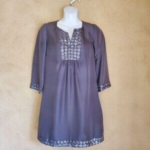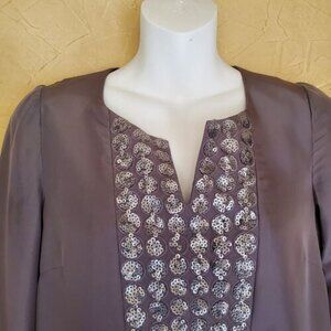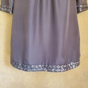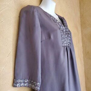 Boden Limited Edition 100% silk tunic blouse with a split v-neckline, sequin embellished, embroidery and side zipper closure. Fully lined. Silver.