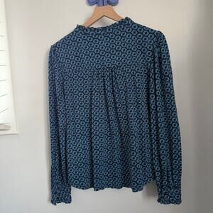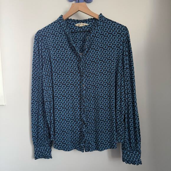 Boden US 16-18 Ruffle Detail Soft Jersey Button Up Shirt High Neck Blue Geo