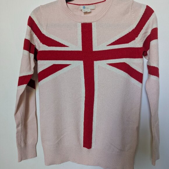 Pink & Red BODEN Union Jack sweater in size XS features long raglan sleeves, a crew neck, and is made of viscose, cashmere, wool, and cotton knit fabric with glitter accents. The classic fit pullover is perfect for winter, fall, and spring. Made in China.