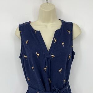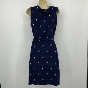 Boden Vanessa jersey knit shift dress navy blue gold metallic flamingos belt 6