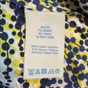 Boden Women’s 6 Blue Yellow Polka Dot Silk Blend Key Hole Short Sleeve Blouse. Pleated neckline with lined collar. Keyhole neck neckline with button closure. In good used condition with no issues.