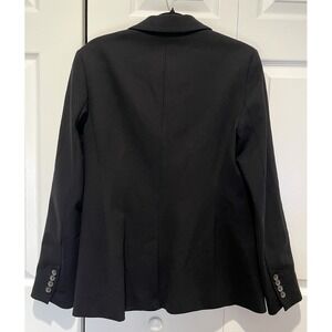 A classic, double button black blazer with blue satin lining. Minimalist, simple, modest. Excellent pre-worn condition with what appears to be deodorant stains in the armpits. No holes or tears noted.