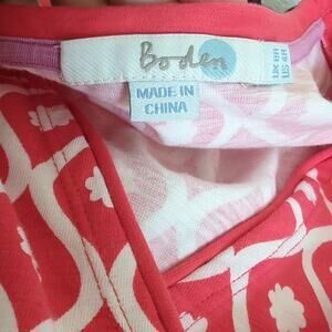 boden women's dress size US 4 UK 8 faux wrap top pink red white geometric pattern fit and flare cap sleeve length 36 flat across under arm 17 flat across waist 14 stretchy fabric no materials tag feels like a cotton spandex blend excellent pre-owned condition.