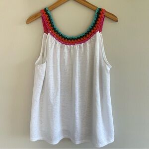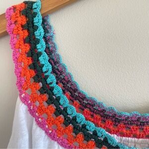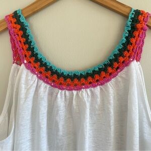 This stylish white sleeveless top features a vibrant multicolor crochet neckline. Perfect for adding a pop of color to your wardrobe.