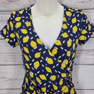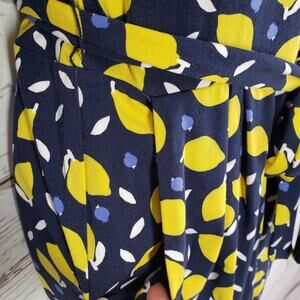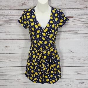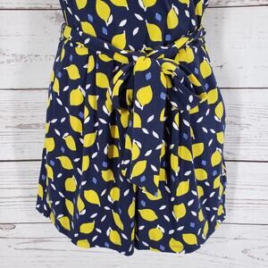 Boden - Women's Blue Yellow Lemon Print Surplice Neck Side Pockets Belted Romper Size 2Petite. Cotton, modal, elastane fabrics. Approx. measurements pit to pit 14 in. Waist 23 in. Inseam 3 in. Romper length 29 in. Does have spots of stains front and back. See Pics. Pre-owned in good condition, no rips or holes.