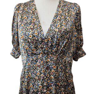 Pretty allover floral print, decorative button down front, short puff sleeves, v-neckline, satin, midi length
