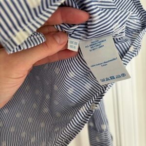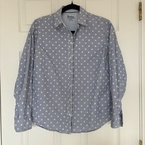 Women's Boden relaxed fit weekend button down shirt. Polka dot and striped pattern. Blue and white. 100% cotton. Size 6. No flaws
