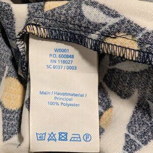 Good condition, minor signs of wear, has a few tiny spots, may come out in wash, no rips, holes or tears, pretty allover swallow print, pullover, 3/4 sleeves
