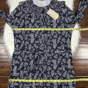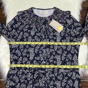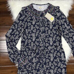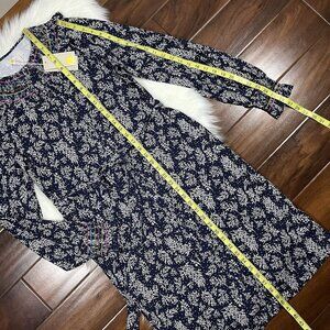 Boden Women's Size US 8L / UK 12L Long French Navy Blue Leafy Sprig Print Smocked Detail Jersey Dress, 50% Cotton 50% Modal, Stretch, Pockets, Tie Belt, Smocked Neckline and Arm Cuffs, Unlined, Button Front