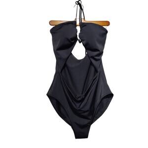 Boden women's black cut out one piece swimsuit. Attached padding in the bra. Ties around the neck. High waist bottoms.