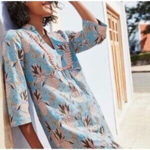 Boden Womens Tunic Top Size 6R Pineapple Print Blue & Pink Bohemian Style Cotton