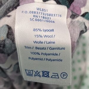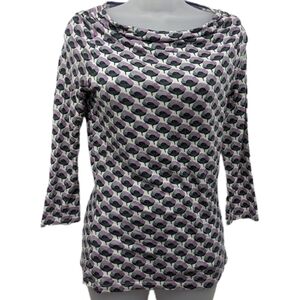 This top is in gently used condition. It is a lightweight wool blend jersey knit material. Features a drape detailing at the neck. The neck is a wide boat neck style. The front is double layered. The sleeves are 3/4 length. Please see photos for details.