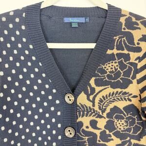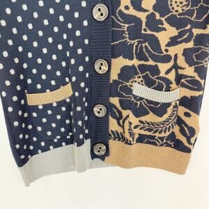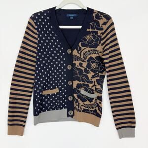 This Boden Cardigan Sweater is 100% wool. It is navy blue, tan and gray, has a striped, floral and polka dot design with color blocking. It has a v-neck, buttons down the front and has pockets. ***There is an area that looks like it has had a pull. There is not a hole. Please, see all photos. ***