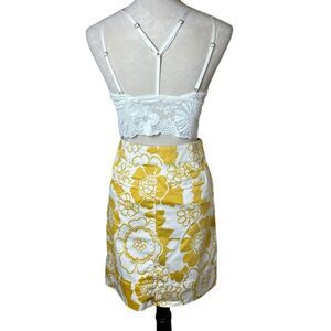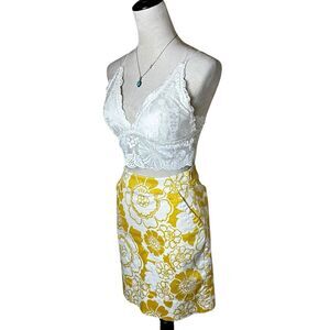 Keywords for search boost: mod floral skirt, retro pencil skirt, 60s style skirt, 60s inspired, vacation floral skirt, cottagecore summer, coastal granddaughter aesthetic, yellow flower skirt, bold print mini skirt, preppy brunch outfit, groovy skirt