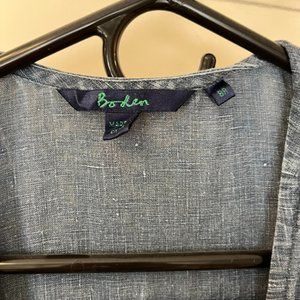 Boden blue heather linen true wrap dress with cap sleeves. 100% linen. In photos it has been dried without crinkle, but if you twist it when wet and allow it to dry that way, the crinkles set for a broomstick skirt intentionally wrinkled look (see picture 4). Fabric has natural slubs, as shown.