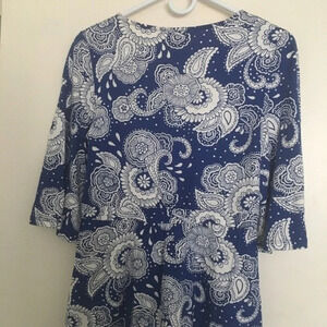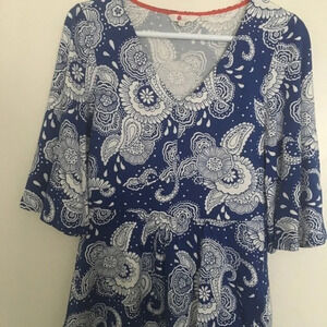 Boden floral print top, size 4. This is a blue and white V-neck pull over top. It has 3/4 length bell sleeves and a swing hem. There are no rips, snags or stains.