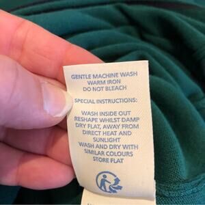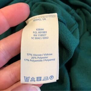 Boden green and navy blue striped trim sweater knit dress. Pullover style with round neckline. Midlength sleeves. Navy blue striped trim on sleeve cuffs and hemline. Midi length. Size 16. A couple of tiny snags as shown. Viscose polyester polyamide blend. Machine wash.
