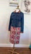 Beige background with orange purple brown pattern, and orange fabric on the top