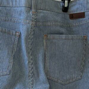 Boden pinstripe jeans in excellent used condition. These are size 10 regular in USA, 14R in UK. These are straight leg and have zippers at the ankle area, making them unique. They are 97% cotton and 3% elastane for nice stretch. Tag says machine wash and tumble dry low. Great condition with no rips, stains or flaws that are detectable.