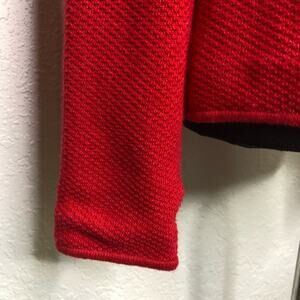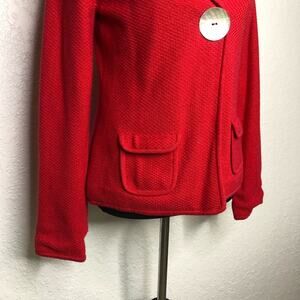 Boden red waffle knit button front blazer jacket. Collared with single statement button front. Double front flap pockets. Fully lined. Size 14. Excellent preowned condition. Minor wash wear. A couple of tiny discolored threads in material. Cashmere angora blend.